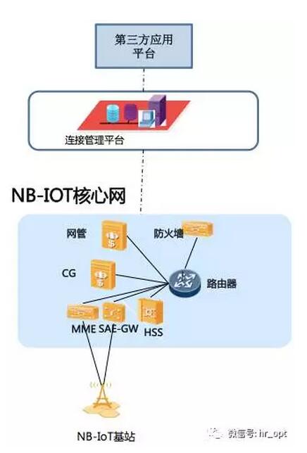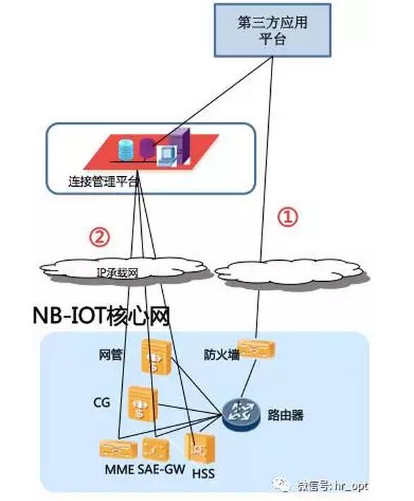 ②連接管理平臺:NB-IoT核心網設備(MME、SAEGW、HSS)通過IP承載網接入連接管理平臺,實現卡數據管理、連接信息查詢等功能。