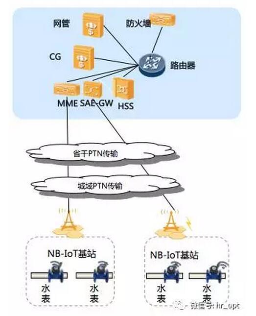 基站與核心網連接:NB-IoT基站接入地市傳輸PTN,再經省干PTN,通過GE光口連接至核心網MME、SAEGW設備。