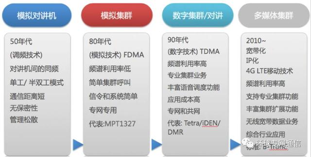 幾十年間,集群對講技術(shù)經(jīng)歷了模擬對講、模擬集群、數(shù)字集群/對講、多媒體集群的發(fā)展過程。