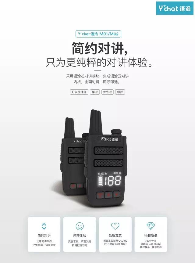 Y'chat 語(yǔ)洽M01,采用語(yǔ)洽芯對(duì)講模塊,集成語(yǔ)洽云對(duì)講內(nèi)核,全國(guó)對(duì)講,即呼即通。小巧于型,強(qiáng)大于