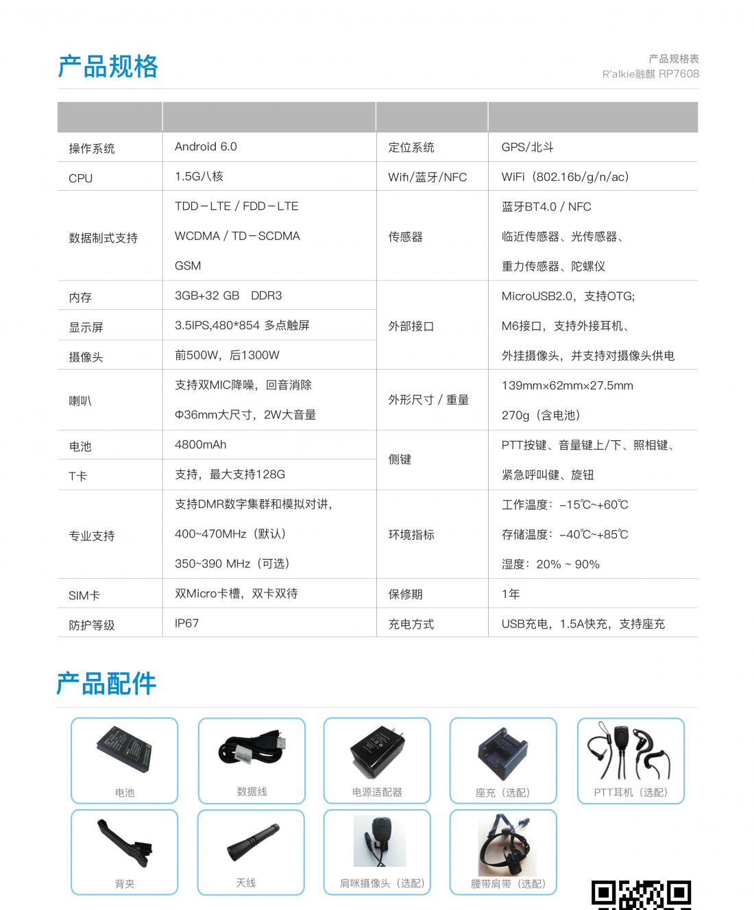 R'alkie 融麒RP7608寬窄融合全能終端,集寬帶4G全網(wǎng)通、WIFI、專業(yè)DMR數(shù)字對講與模擬對講于一身;配備專業(yè)PTT按鍵,通過專業(yè)音頻設(shè)計達(dá)到媲美專業(yè)對講機的音效;3.5吋大屏有效擴展行業(yè)用戶對圖像、視頻、數(shù)據(jù)業(yè)務(wù)應(yīng)用的需求;IP67高防護(hù)性、電池超長續(xù)航、GPS/北斗精確定位、集成NFC擴展應(yīng)用,同時可支持外接高清紅外攝像頭等設(shè)備,是融合通訊應(yīng)用不可多得的全能優(yōu)質(zhì)終端產(chǎn)品。