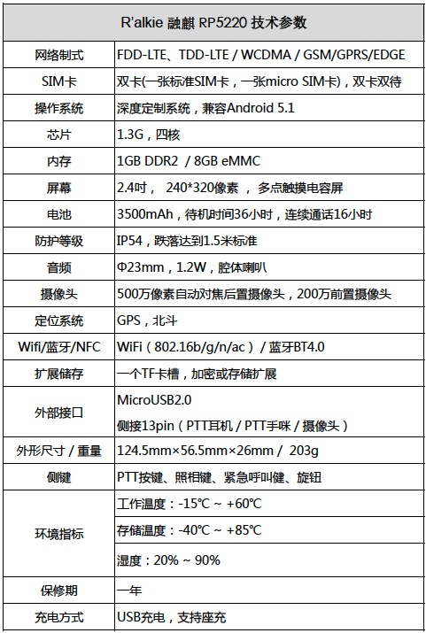 R'alkie 融麒RP5220行業(yè)超值智能終端,集寬帶WCDMA、GSM、WIFI于一身;配備專業(yè)PTT按鍵,通過專業(yè)腔體喇叭設計達到媲美專業(yè)對講機的音效;2.4吋屏能夠擴展行業(yè)用戶對圖像、視頻上傳業(yè)務需求;同時可支持外接高清紅外攝像頭等設備,是融合通訊應用超值終端產(chǎn)品。 R'alkie 融麒RP5220通過“融洽融合通”平臺認證,完美呈現(xiàn)“融洽融合通”優(yōu)秀用戶體驗。