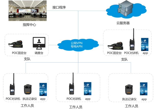 為滿足城管執(zhí)法人員在工作調(diào)度與人員管理上的業(yè)務(wù)需求,融洽科技針對(duì)其工作特點(diǎn),提出了基于應(yīng)急指揮與日常巡邏管理的多媒體集群調(diào)度解決方案,該方案由調(diào)度平臺(tái)和手持對(duì)講終端組成,還可以根據(jù)實(shí)際情況配置執(zhí)法記錄儀,并通過平臺(tái)端與終端的配合,提升管理效率。